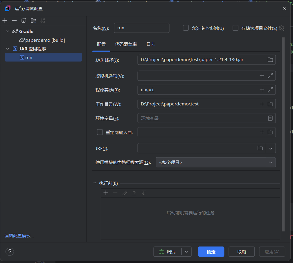 7. 主类:带上包名。包名的前面部分通常是一个域名的转置,例如net.minecraft。Java不会判断你是否拥有这个域名,因此你可以填写com.example.paperdemo.Paperdemo,但请注意不要填写net.minecraftorg.bukkit等你可能会使用的名称作为域名部分。